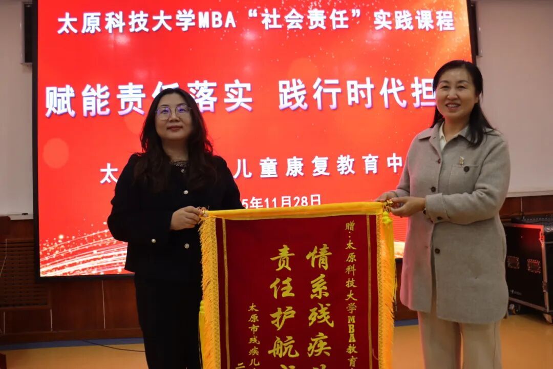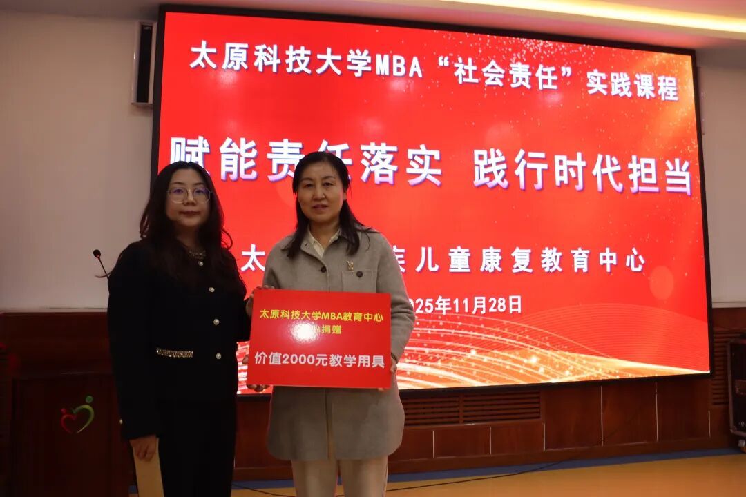 11月28日下午,太原市残疾儿童康复教育中心教室暖意融融,437ccm必赢国际首页欢迎您MBA教育中心“赋能责任落实 践行时代担当”“社会责任”实践课程在此温情启幕。学院副院长关海玲、太原市残疾儿童康复教育中心主任张婧、学院MBA教育中心教师王跃敏以及2025级MBA/MEM学员共同参与,以实际行动诠释高校教育与社会机构的责任联动。