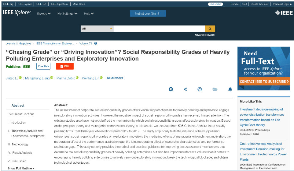 近日,我校企业社会责任中心课题团队在重污染企业社会责任履行和技术创新领域取得重要进展,相关工作以“Chasing Grade” or “Driving Innovation”? Social Responsibility Grades of Heavily Polluting Enterprises and Exploratory Innovation”为题(https://ieeexplore-ieee-org-s.webvpn.tyust.edu.cn/document/10570302),在线发表于管理科学权威期刊IEEE Transactions on Engineering Management(ABS三星刊物,SSCI-JCR Q1,IF 4.6)。我校为第一作者单位,鲁锦涛教授为第一作者。该工作得到教育部人文社会科学研究规划基金项目、山西省政府重大决策咨询课题、山西省科技战略研究专项重点项目和山西省高校中青年拔尖创新人才项目资助。